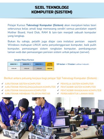 SIJIL TEKNOLOGI KOMPUTER (SISTEM)Pelajar Kursus Teknologi Komputer (Sistem) akan menjalani kelas teoriseterusnya kelas amali bagi memasang sendiri semua peralatan sepertiMother Board, Hard Disk, RAM & lain-lain menjadi sebuah komputeryang lengkap.Bukan itu sahaja, pelatih juga diajar cara instalasi perisian sepertiWindows mahupun LINUX serta penyelenggaraan komputer, baik pulihkomputer, pemasangan sistem rangkaian komputer, pembangunanlaman web dan pemasangan perisian sistem untuk pelayan (server).Berikut antara peluang kerjaya bagi pelajar Sijil Teknologi Komputer (Sistem) : JURUTEKNIK SISTEM KOMPUTER JURUTEKNIK PENYELENGGARAAN KOMPUTER JURUTEKNIK RANGKAIAN KOMPUTER JURUTEKNIK MEMBAIKI TELEFON PINTAR PENYELIA SISTEM KOMPUTER PENTADBIR SISTEM KOMPUTER PENTADBIR RANGKAIAN KOMPUTER PEREKABENTUK LAMAN WEBJangka Masa Kursus1 tahun 9 bulan (21 bulan) termasuk Latihan Industri.SEMESTER 1 SEMESTER 2 SEMESTER 3 LATIHAN INDUSTRI6 BULAN 6 BULAN 6 BULAN 3 BULAN