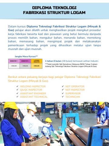 DIPLOMA TEKNOLOGI FABRIKASI STRUKTUR LOGAMDalamkursusDiplomaTeknologiFabrikasiStrukturLogam(Minyak&Gas)pelajarakandilatihuntukmenghasilkanprojekmengikutprosedurkerjafabrikasibesertakoddanpiawaianyangbetulbermuladaripadaprosesmemilihbahan,mengukurbahan,menandabahan,memotongbahan,memasangbahan,mengimpalprojekdanmelaksanakanpemeriksaanterhadapprojekyangdihasilkanmelaluiujiantanpamusnahdanujianmusnah.BerikutantarapeluangkerjayabagipelajarDiplomaTeknologiFabrikasiStrukturLogam(Minyak&Gas):WELDINGINSPECTORQA/QCINSPECTORASSISTANTENGINEERASSISTANTTECHNICALNDTOPERATORNDTINSPECTORSUPERVISORTECHNICIANSEMESTER 1SEMESTER 21 tahun 6 bulan (18 bulan) termasuk Latihan Industri.LATIHAN INDUSTRI6 BULAN6 BULAN6 BULAN**Telah memiliki Sijil Kemahiran Malaysia (SKM) Tahap 3 dalam bidang Sijil Teknologi Fabrikasi Struktur Logam (Minyak & Gas).Jangka Masa Kursus**
