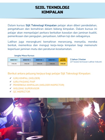SIJIL TEKNOLOGI KIMPALANDalamkursusSijilTeknologiKimpalanpelajarakandiberipendedahan,pengetahuandankemahirandalambidangkimpalan.Dalamkursusinipelajarakanmempelajariperkaraberkaitankawalandanjaminankualiti,pemeriksaandanpengujian,penyeliaan,latihanlojidansebagainya.Latihanjugamerangkumikemahiranmerancang,menyelia,merekabentuk,memeriksadanmengujikerja-kerjakimpalanbagimemenuhikeperluanjaminanmutudanperaturankeselamatan.BerikutantarapeluangkerjayabagipelajarSijilTeknologiKimpalan:JURUKIMPAL(WELDER)JURUPASANGPAIPPEMERIKSAKIMPALAN(WELDERINSPECTOR)WELDINGSUPERVISORQCINSPECTORSEMESTER 1SEMESTER 2SEMESTER 3SEMESTER 4LATIHAN INDUSTRI6 BULAN6 BULAN6 BULAN6 BULAN3 BULAN2 tahun 3 bulan (27 bulan) termasuk Latihan Industri.Jangka Masa Kursus